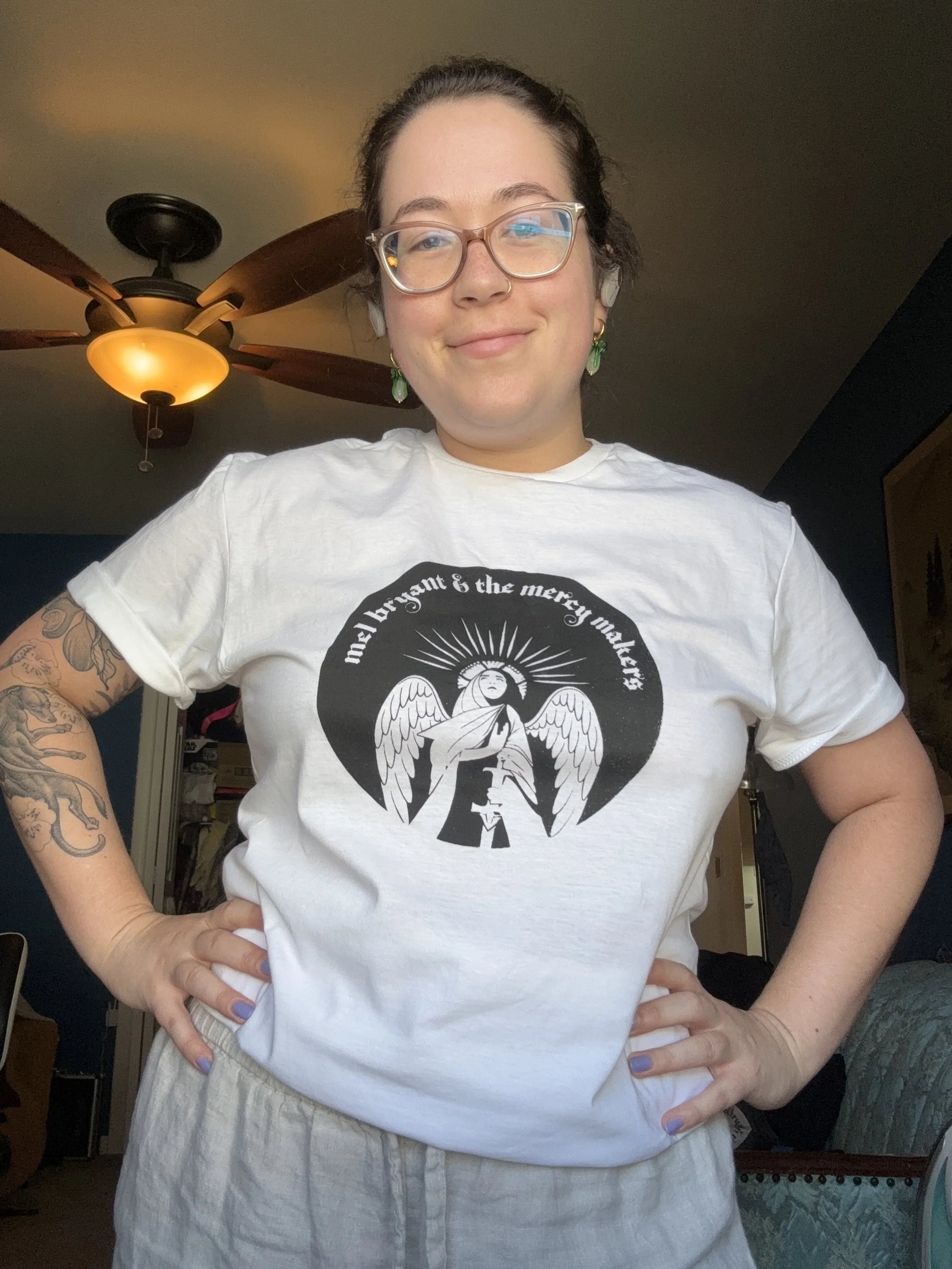 These cotton t shirts were screen printed BY HAND by yours truly and designed by my sister Gabby. they feature the cover art of my first album, high priestess, which was released in 2017.